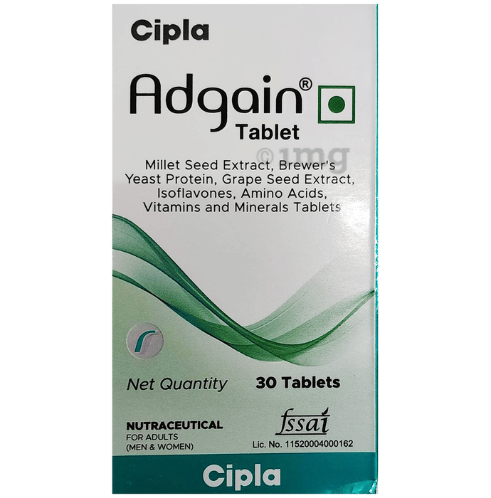 Cipla Adgain Tablet is a nutritional supplement formulated with a combination of plant extracts, amino acids, vitamins, minerals, and antioxidants that can help provide targeted nutritional support for hair health and overall wellness. The formulation includes Millet Seed Extract and Brewer’s Yeast Protein, which contribute plant-based nutrients commonly included in hair nutrition regimens. Amino acids such as L-Cysteine and DL-Methionine contribute to the nutritional building blocks associated with hair structure. Isoflavones from soya, grape seed extract, and essential micronutrients like zinc, iron, biotin, folic acid, and vitamins help support balanced nutrition. Regular intake as part of a varied diet can help maintain hair strength, scalp nourishment, and overall nutrient adequacy without replacing medical treatment.