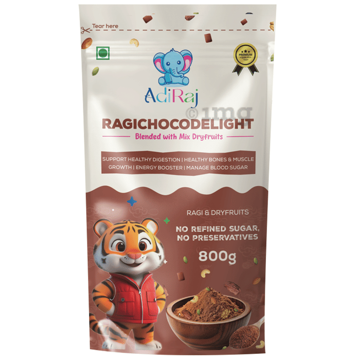 AdiRaj Ragi Choco Delight is a nutraceutical food blend made from Ragi (Finger Millet), dry fruits (almond, cashew, walnut, pumpkin seeds), cocoa, organic jaggery powder, and dry dates. Ragi is naturally rich in calcium and dietary fibre and can help support bone strength and digestion. Cocoa and dry fruits provide protein, minerals like iron and zinc, and healthy fats that support energy, muscle growth, and cognitive development. The organic jaggery and dry dates add natural sweetness without refined sugar. This formulation can be part of a balanced diet for growing children, active adults, and individuals seeking natural nourishment.