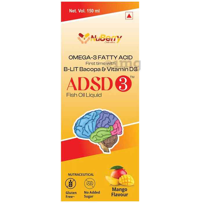 ADSD 3 Fish Oil Liquid Mango Flavour is a nutraceutical suspension formulated to support cognitive development, immunity, and bone health. Each serving delivers a synergistic combination of Omega-3 fatty acids (EPA & DHA), Bacopa monnieri (B-Lit Bacopa®), and Vitamin D3 in a tasty mango-flavoured liquid. This supplement is especially suited for individuals requiring nutritional support for growth, mental focus, and immunity.
