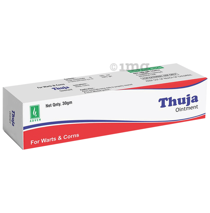 Adven Thuja Ointment is a homeopathic topical formulation enriched with Thuja, designed to offer support in managing various abnormal skin growths such as warts, polyps, and corns. It may be helpful in addressing fungal infections, rough skin patches, and recurring eruptions that affect the appearance and comfort of the skin. Its gentle nature makes it suitable for daily use in individuals dealing with localized skin thickening, dryness, and pigmentation concerns.