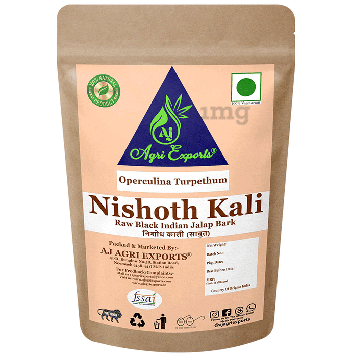 Aj Agri Exports Operculina Turpethum Nishoth Kali contains raw, dried bark of Operculina turpethum (Black Indian Jalap Bark), which has been used in various wellness practices. This herb is known in Ayurveda for its potential role in supporting digestive and detoxification processes. It may help in maintaining a balanced gut environment and is often used in herbal formulations aimed at cleansing and supporting gastrointestinal health. Additionally, its antimicrobial properties may help guard against infections. Nishoth Kali's analgesic anti-inflammatory properties may help in easing inflammation. Processed and packaged hygienically, this product ensures purity and effectiveness.