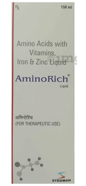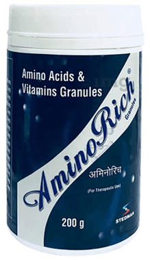 Aminorich Granules: Aminorich Granules contains a combination of essential nutrients and amino acids. Vitamin B12 maintains healthy nerve and red blood cells, while methionine is crucial for protein synthesis. L-Arginine, a semi-essential amino acid, gets converted into nitric oxide, improving blood flow. Pyridoxine plays a role in blood cell production and metabolism, and multivitamins are vital for growth and the nervous system. Amino acids aid nutrient absorption and body development. Folic acid contributes to red blood cell health, nerve function, and heart health. Together, these components support overall well-being and bodily functions. Key Ingredients: L-Isoleucine USP 100 mg,L-Proline USP 25 mg,L-Leucine USP 125 mg,L-Glutamine USP 150 mg,L-Valine USP 75 mg,L-Arginine IP 100 mg,L-Lysine Hydrochloride USP 150 mg,Pyridoxine Hydrochloride IP 1.5 mg,L-Methionine USP 25 mg,Niacinamide IP 50 mg,L-Threonine USP 25 mg,Folic Acid IP 0.75 mg,L-Phenylalanine USP 50 mg,Cyanocobalamin IP 7.5 mcg,L-Tryptophan USP 5 mg Key Benefits: