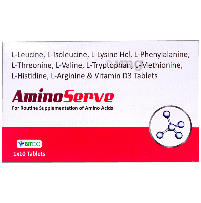 AminoServe Tablet is a dietary food supplement designed for routine supplementation of amino acids and vitamin D3. It can help in maintaining amino acid balance in the body and supporting nutritional needs. The product can help in maintaining muscle strength, bone density, daily nourishment, and general wellness when taken as directed.