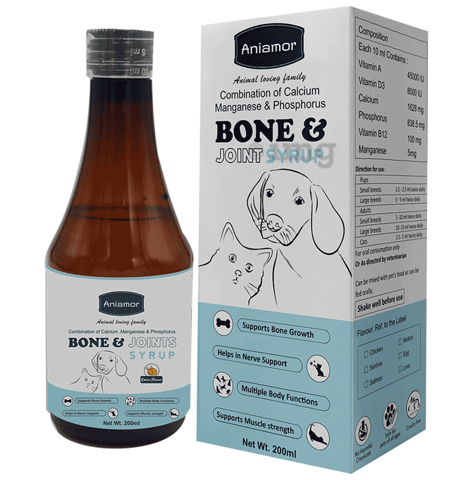 Aniamor Bone & Joint Syrup Chicken Flavour helps to increase bone density and strength. It Contains calcium and phosphorus, which aids the buyer to get the best quality syrup. It increases bone and teeth strength in adult dogs and cats. It reinforces the skeletal system and supports healthy joints. It helps to reduce inflammation, and pain, improve function, and slow the progression of joint damage. These benefits make it highly recommendable by buyers for pets.