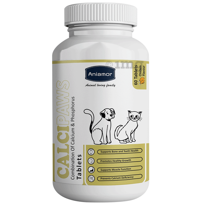 Aniamor Calcipaws Tablet Chicken is a nutritional calcium and phosphorus supplement that may help maintain bone, muscle, and overall skeletal health in dogs and cats. This formula is designed to help support puppies, kittens, adults and senior pets through various life stages where calcium needs may increase, including growth phases, pregnancy, lactation or old age. These chewable tablets can be given daily to help maintain calcium balance and ensure the structural integrity of bones and teeth in pets.
