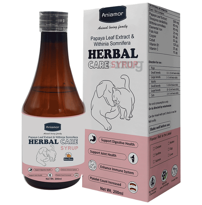Aniamor Herbal Care Syrup Chicken Flavour is made of carioca papaya extract fortified with essential vitamins and minerals. It contains natural extracts for dogs and cats. The syrup helps in stress management and strengthens the immune system. Aniamor herbal care syrup is the best-proven remedy for anaemia that supports red blood cell production. There are no side effects reported for this product.