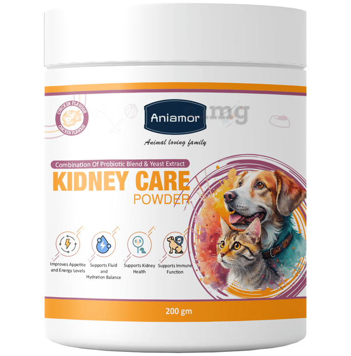 Aniamor Kidney Care Powder is a scientifically developed animal feed supplement formulated to help support kidney function and general wellness in dogs and cats. Enriched with a synergistic combination of probiotic blends, prebiotic fibres, vitamins, and beta-glucans, this formulation may help maintain the fluid and electrolyte balance essential for the health of pets. With added yeast extract and chicken flavour, it may also contribute to palatability and appetite, making it a convenient daily addition to your pet’s nutrition routine. This supplement is designed to complement regular veterinary care and may be helpful in maintaining kidney health, immune function, energy levels, and digestive balance.