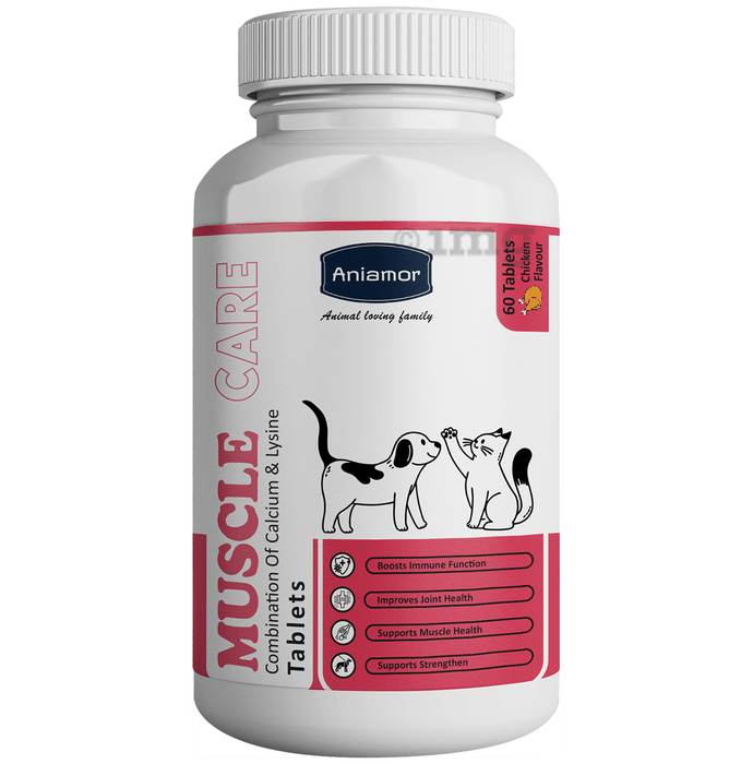 Aniamor Muscle Care Tablet is formulated for dogs and cats to help support overall musculoskeletal wellness. These tablets contain a unique combination of calcium and lysine, that may help in maintaining muscle function and skeletal strength. Ideal for pets of all ages, especially active and senior animals, this supplement can help in maintaining joint flexibility, supporting muscle development, and assisting in daily mobility. With a palatable chicken flavour, these tablets are easy to administer and suitable for both small and large breed dogs and cats. These tablets can be particularly beneficial for pets that are active, athletic, or elderly as they may experience muscle fatigue, soreness, and stiffness. The tablets can help support their overall muscle health and performance, as well as support muscle recovery.