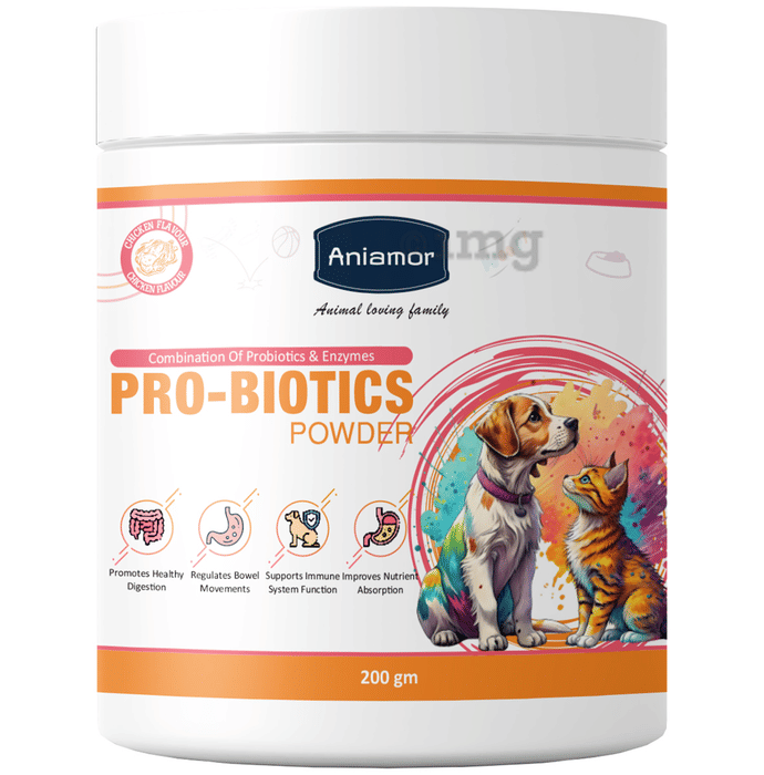 Aniamor Pro-Biotics Powder is a carefully crafted nutritional supplement designed for the digestive and immune health of dogs and cats. This chicken-flavoured powder combines probiotics and enzymes that may help support overall gastrointestinal function, nutrient absorption, and intestinal balance. With a potent mix of beneficial bacteria and digestive enzymes, it offers a convenient daily solution that contributes to your pet’s comfort, vitality, and well-being. Whether it’s supporting healthy digestion, maintaining bowel regularity, or immune function, this supplement may play an important role in maintaining pet wellness from the inside out.