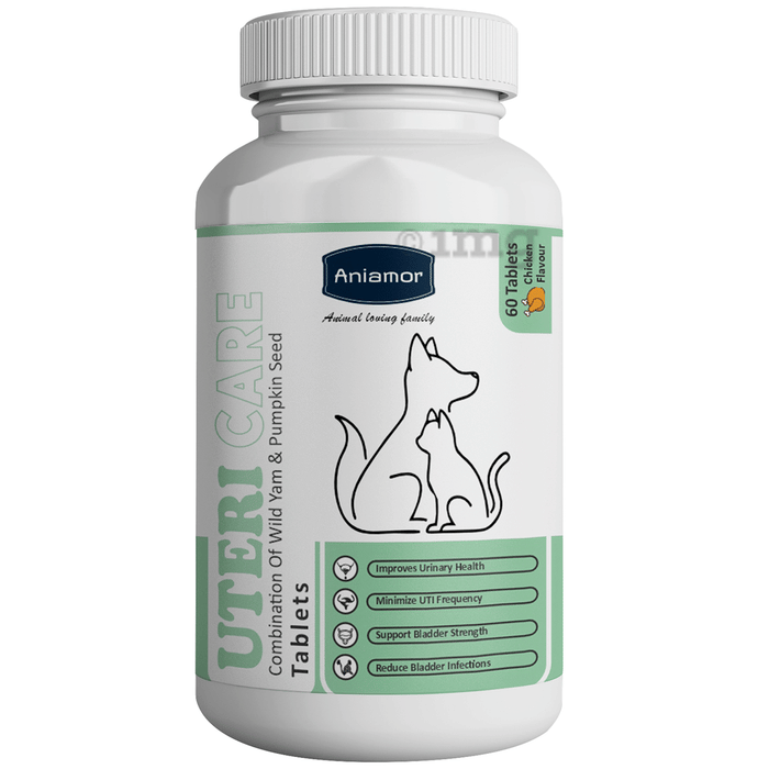 Aniamor Uteri Care Tablet is specially formulated to help support urinary and bladder wellness in pets. This supplement features a combination of Wild Yam and Pumpkin Seed, blended into a palatable chicken-flavoured tablet format, making it ideal for both dogs and cats. The formulation may contribute to urinary tract comfort, help maintain bladder function, and may help support a healthy urinary routine. Suitable for growing, adult, and senior pets, it can be a beneficial addition to a daily health regimen under veterinary guidance.