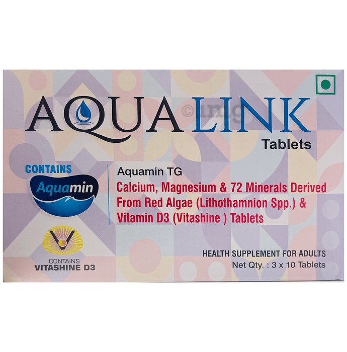Aqua Link Tablet (10 Each) is a plant-based nutritional supplement that combines Aquamin TG, a red algae-derived multimineral complex, with vegan Vitamin D3 sourced from lichen. Each tablet provides elemental calcium, magnesium, and 72 trace minerals such as potassium, boron, and selenium, which can support the body's mineral intake in a convenient form. This formulation can help maintain general bone strength and mineral balance, while Vitamin D3 can contribute to calcium absorption and physiological stability when taken regularly. Designed to complement dietary requirements, AquaLink Tablets can assist individuals looking for a natural and vegetarian-friendly source of essential micronutrients.