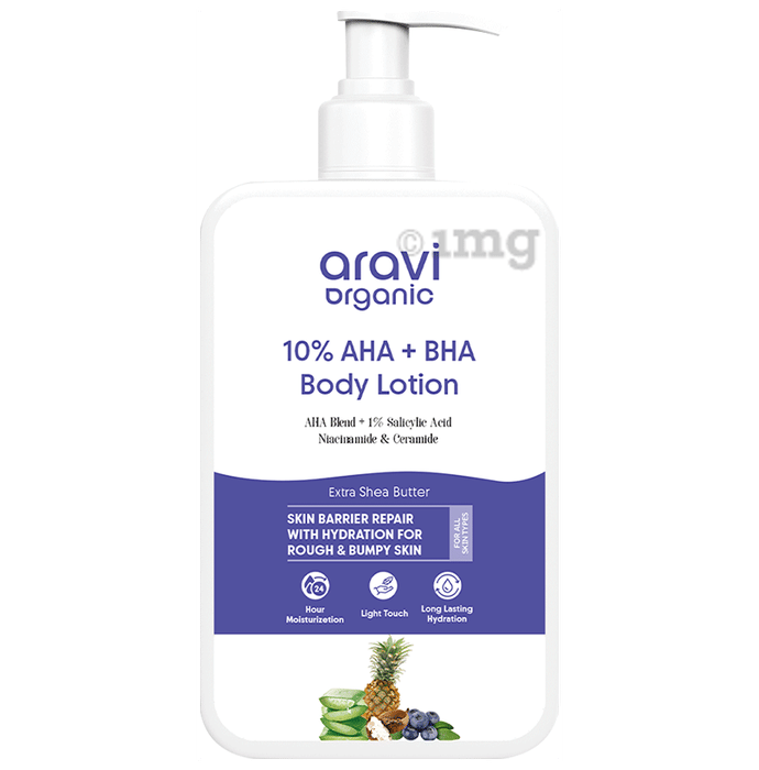 Aravi Organic 10% AHA BHA Body Lotion is a specially formulated skincare solution designed to help provide intense hydration while improving skin texture. Enriched with a powerful combination of 10% AHA (Glycolic Acid, Lactic Acid) and 1% BHA (Salicylic Acid), it can help gently exfoliate dead skin cells, unclog pores, and promote smoother and more even-toned skin. This advanced formula also contains Niacinamide, Shea Butter, and a blend of natural fruit extracts like Blueberry, Papaya, and Pineapple which can help replenish moisture, soothe dryness, and protect the skin against environmental damage. The fast-absorbing formula can help ensure long-lasting hydration without leaving a greasy residue. Ideal for individuals looking to help manage rough, bumpy, or dehydrated skin, this lotion may deliver a vibrant and youthful glow with regular use.