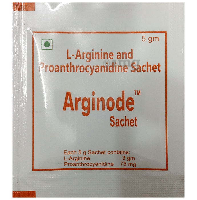 Arginode Sachet (5gm Each) is an L-arginine and proanthocyanidins sachet that helps improve blood circulation in the body. L-arginine is an amino acid naturally found in meat and dairy that helps make proteins and improves circulation. Proanthocyanidin has antioxidant, anti-inflammatory and vasodilating properties.