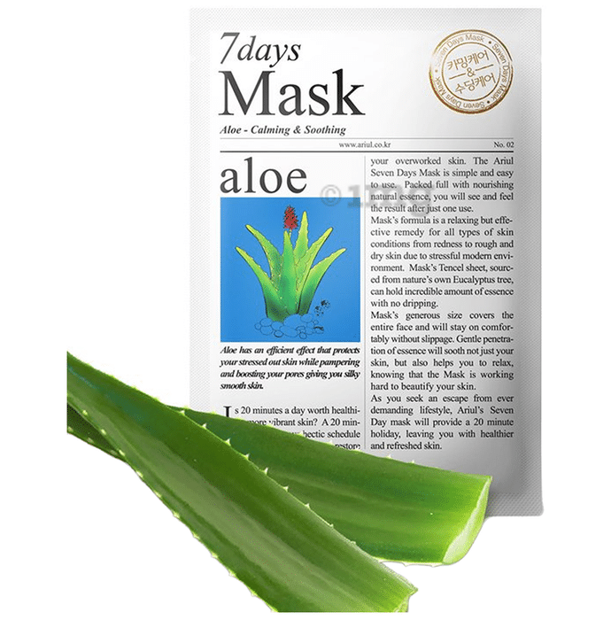 Arirul 7 Days Mask (23gm Each) Aloe is effective for moisturising the skin without making it oily. It aids in the rejuvenation and revitalisation of the skin by reducing redness and irritation. It contains Aloe vera extract, which soothes inflamed skin, cools it, and repairs the skin's moisture barrier. It calms and revitalises skin that has been stressed due to environmental factors or a lack of sleep.