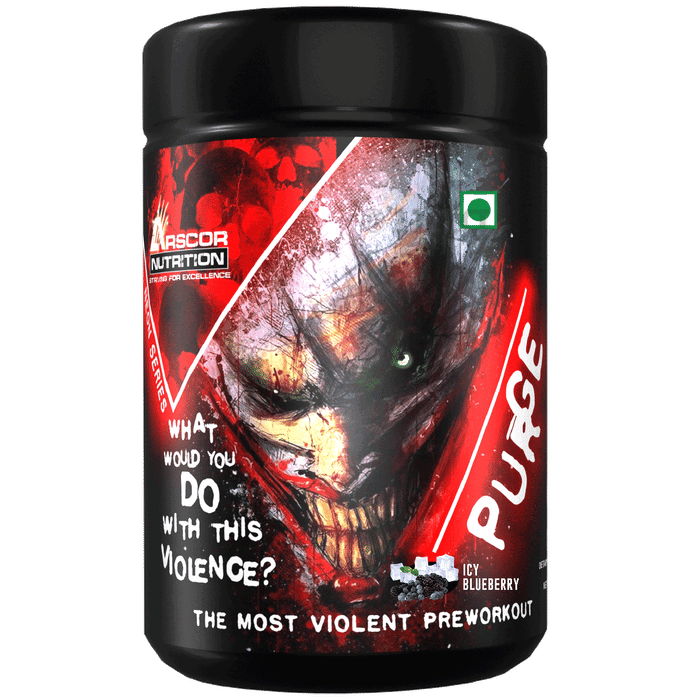 Arscor Nutrition Purge Powder Icy Blueberry is a strong stimulant pre-workout formulated to provide functional support during training. It is described as the most violent pre-workout, designed to amplify focus, maintain strength and power, and increase endurance.