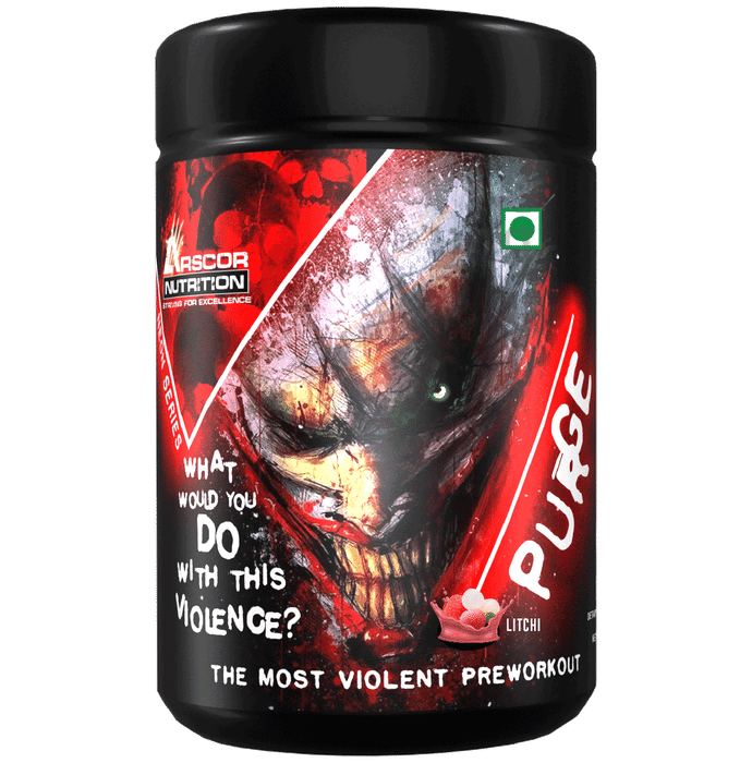 Arscor Nutrition Purge Powder Litchi is a strong stimulant pre-workout formulated to provide functional support during training. It is described as the most violent pre-workout, designed to amplify focus, maintain strength and power, and increase endurance.