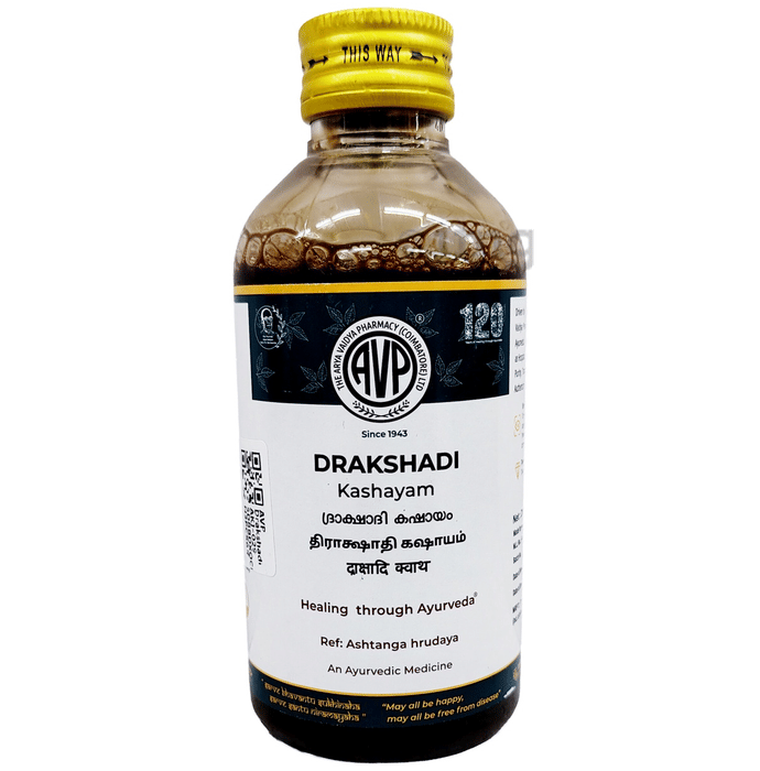 AVP Drakshadi Kashayam can help restore vata-pitta balance in the body. It is a herbal decoction that contains the healing properties of herbs and roots in a mild and easily absorbable water base. The Ayurvedic formula can help regulate body temperature. Draksha helps alleviate excessive thirst and burning sensation. Madhooka acts as a nourishing and anti-fatigue agent. Yashtimadhu acts as a coolant.