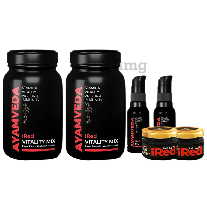 Ayamveda Combo Pack of i Red Massage Oil, Shilajit Resin & Vitality Mix Sugar Free with Vanila Flavour