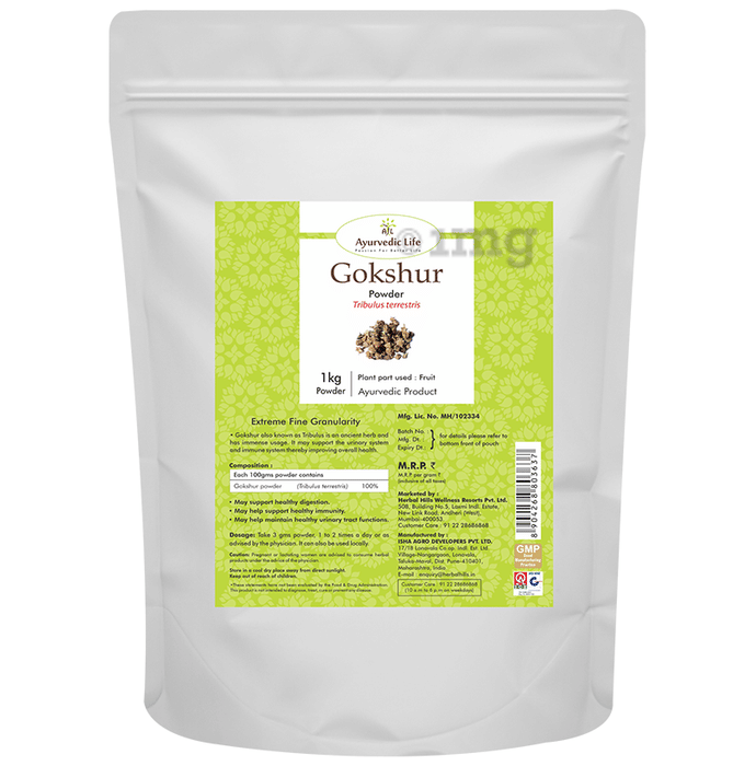 Ayurvedic Life Gokshur Powder Gokshura or Gokhru, also called Tribulus terrestris, is synergistically processed with highly advanced technology. Ayurvedic Life company is Indias largest online-selling brand in pure herbal powders. This product is halal certified and the ingredients in this product are natural and vegetarian. This gokhru powder can be used for Ayurvedic purposes. Gokhru may support strength, and vitality. It may manage kidney health and has rejuvenating properties.