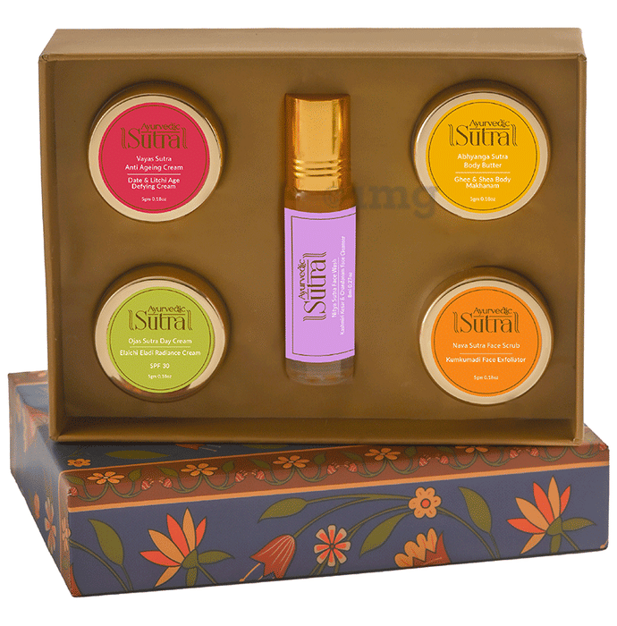 Ayurvedic Sutra Skincare Trial Kit a carefully curated collection of five transformative Ayurvedic products. This comprehensive kit includes the Date and Litchi Age-Defying Night Cream, Gir Cow Ghee and Shea Body Butter Moisturiser, Kumkumadi Exfoliator Face Scrub, Saffron Face Wash Cleanser, and Elaichi Eladi Radiance SPF 30 Day Cream. Each product is enriched with potent Ayurvedic elements designed to nourish, rejuvenate, and brighten the skin, leaving it radiant, youthful, and glowing. Suitable for all skin types, this kit encapsulates the timeless wisdom of Ayurveda to offer a natural skincare regimen that promotes healthier, more vibrant skin.