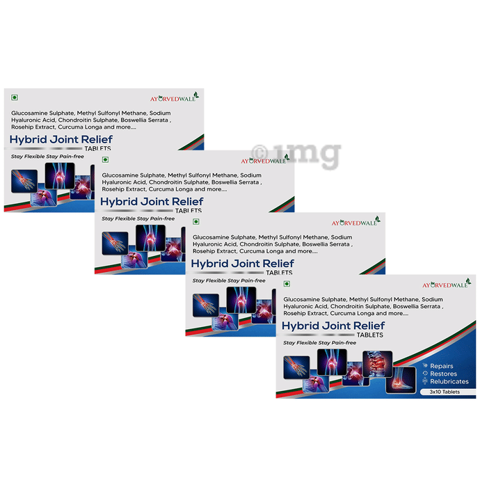 Ayurvedwale Hybrid Joint Relief Tablet is a synergistic blend of ingredients that may help maintain joint, cartilage, and muscle health. Designed to help support joint lubrication and flexibility, this formulation contains key components that may assist in maintaining mobility and overall joint function. It is enriched ingredients such as Glucosamine, Chondroitin, Hyaluronic Acid, and natural extracts like Boswellia and Rosehip, which may help contribute to joint comfort. This supplement may assist individuals in leading an active lifestyle by helping support joint health, flexibility, and movement.