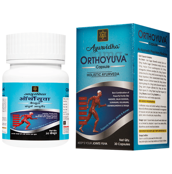 Ayurvidha Orthoyuva Capsule (30 Each) Bottle is a natural Ayurvedic formulation for bone and muscle health and wellness. It comprises more than 10 natural herbs and 13 herbal extracts. It infuses natural ingredients like suranjan, salai guggul, shuddha guggul, kulanjan, hadjod, ashwagandha, chopchini, haldi, kushta, shilajit, etc. that might help in reducing inflammation and maintaining bone health. The capsule can provide fast joint pain relief and strengthen muscles.