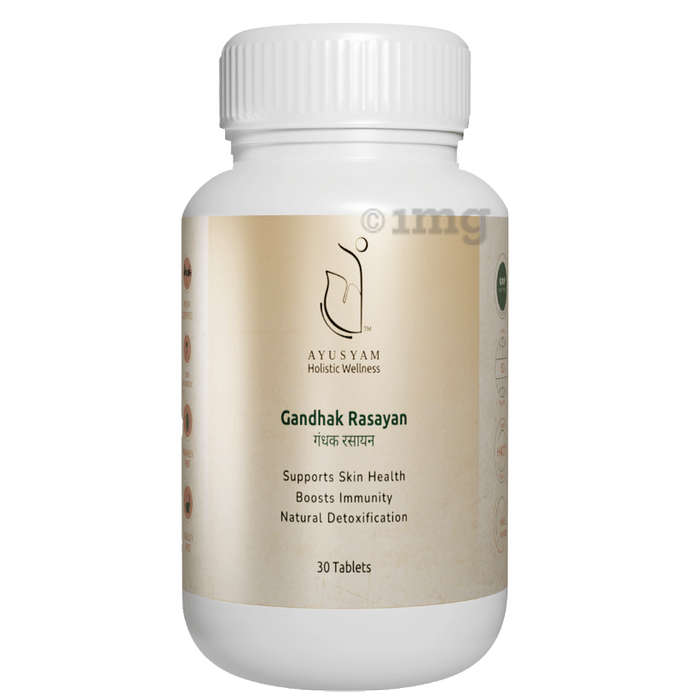 Ayusyam Gandhak Rasayan Tablet is an Ayurvedic supplement formulated to help support skin health, support immunity, and promote natural detoxification. Enriched with Shudh Gandhak, Dalchini, Tejpat, Ela Choti, Nagkesar, and other powerful herbs like Giloy, Behra, Amla, and Sonth, this remedy can help cleanse the body, enhance the immune system, and improve skin vitality. Regular use of Gandhak Rasayan helps rejuvenate the skin, support overall well-being, and strengthen the body’s natural defenses.