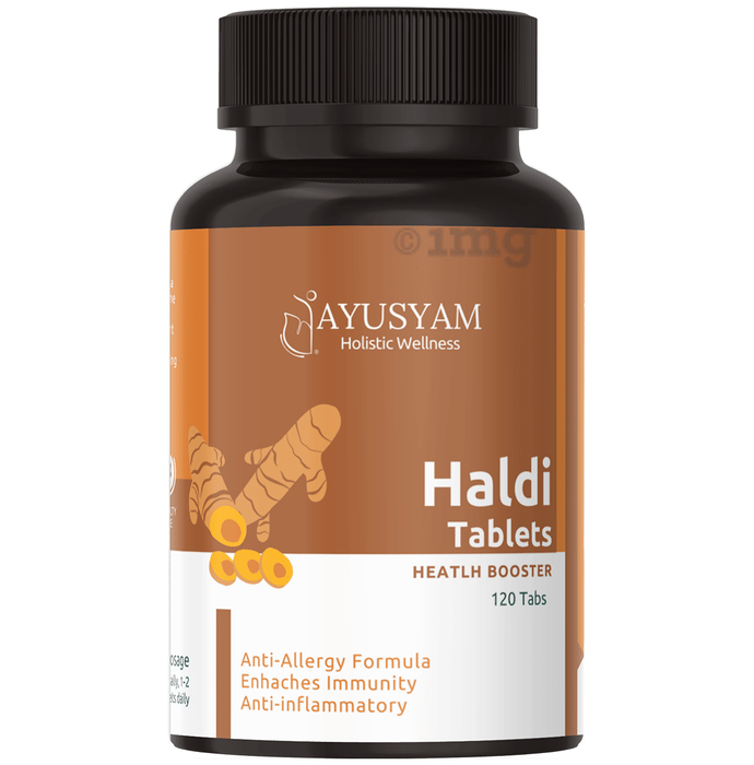 Ayusyam Haldi Tablet is an Ayurvedic formulation containing a pure extract of Curcuma longa. The composition is designed to align with wellness practices that focus on supporting immune health, physiological balance, and internal comfort. The presence of high-potency curcumin extract in each tablet can support general well-being, while the natural composition may complement the body's processes for maintaining joint comfort, energy balance, and internal harmony. This formulation is crafted to be suitable for daily wellness regimens and comes in an easy-to-consume tablet form.