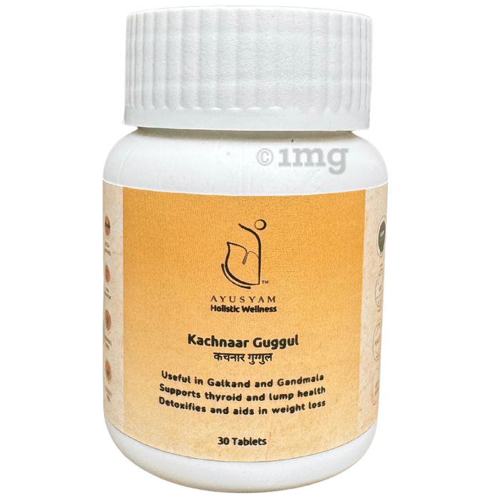 Ayusyam Kachnaar Guggul Tablet is an Ayurvedic formulation made with herbs like Kachnar, Trikatu, and Guggul. This blend is traditionally used to help support thyroid health, manage lymph node health, and aid in detoxification. The ingredients are known for their role in maintaining hormonal balance and supporting overall vitality.