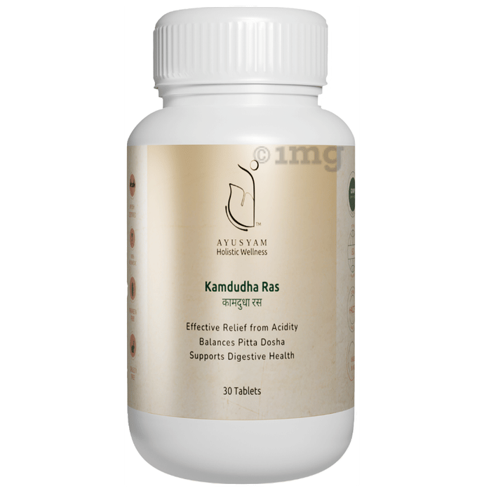 Ayusyam Kamdudha Ras Tablet is an Ayurvedic formulation designed to help provide effective relief from acidity, balance Pitta dosha, and support digestive health. This potent blend of Praval Pishti, Mukta Shukti Bhasma, Kapardik Bhasma, Shankh Bhasma, Svarna Gairik, and Guduchi Satva help soothe the digestive system, reduce acid reflux, and improve overall gut health. Regular use of Kamdudha Ras can help maintain digestive balance and provides long-lasting relief from stomach discomfort.