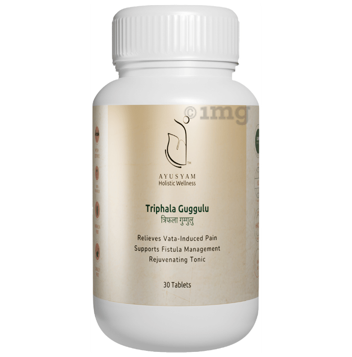 Ayusyam Triphala Guggulu Tablet is an Ayurvedic supplement designed to help relieve Vata-induced pain, support fistula management, and act as a rejuvenating tonic. Formulated with Triphala Churna, Peepal, Shuddh Guggul, and Ghrita, this remedy helps balance the Vata dosha, reduce inflammation, and promote overall healing. Regular use of Triphala Guggulu can help rejuvenate the body, enhance vitality, and maintain digestive and immune health.