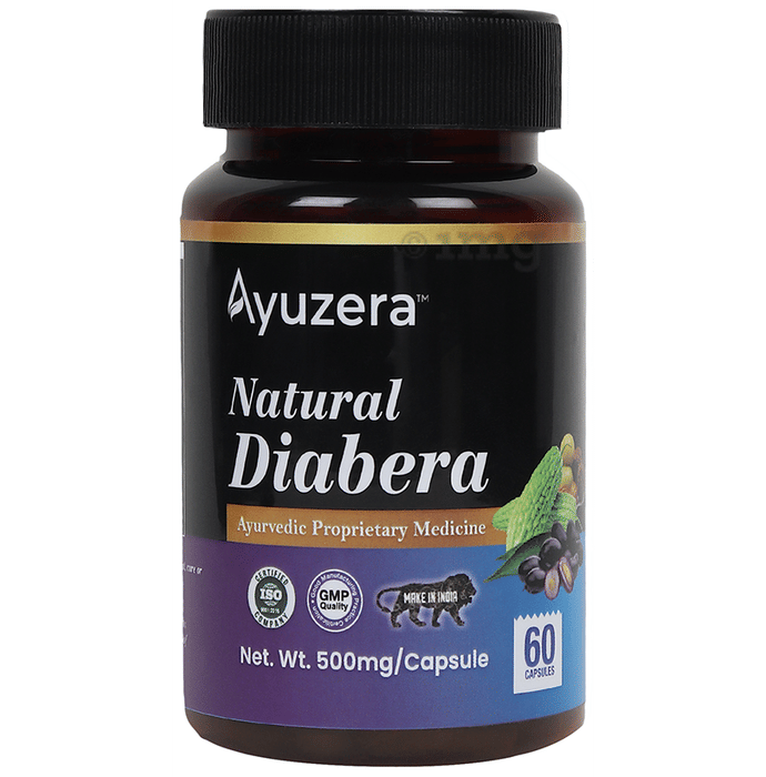 Ayuzera Natural Diabera 500mg Capsule is a proprietary Ayurvedic medicine formulated with a blend of herbs that may help manage blood sugar levels and support healthy vitality and overall metabolic health. The unique formulation combines traditional herbs known for their properties in promoting better sugar metabolism and supporting pancreatic function. The capsules may also help support lipid metabolism, reduce glucose absorption in the intestines, and help maintain healthy energy levels throughout the day.