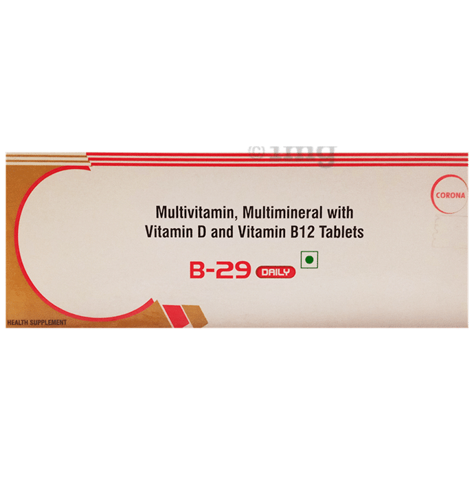 - Vitamin C and other key vitamins support a robust immune system and protect the body from various illnesses and infections; B-complex vitamins, including niacinamide and vitamin B12, aid in energy metabolism, skin health and nerve health; Vitamins A, D, and minerals like phosphorus and magnesium promote eye, skin and bone health; B vitamins, including B1, B2, and B5, support proper nervous system function; Folic acid and iron play a crucial role in red blood cell formation and aid in reducing the risk of anaemia; Essential minerals like potassium, zinc, manganese, copper, and iodine ensure overall health; B 29 daily tablet offers a comprehensive approach to fulfilling daily nutritional needs