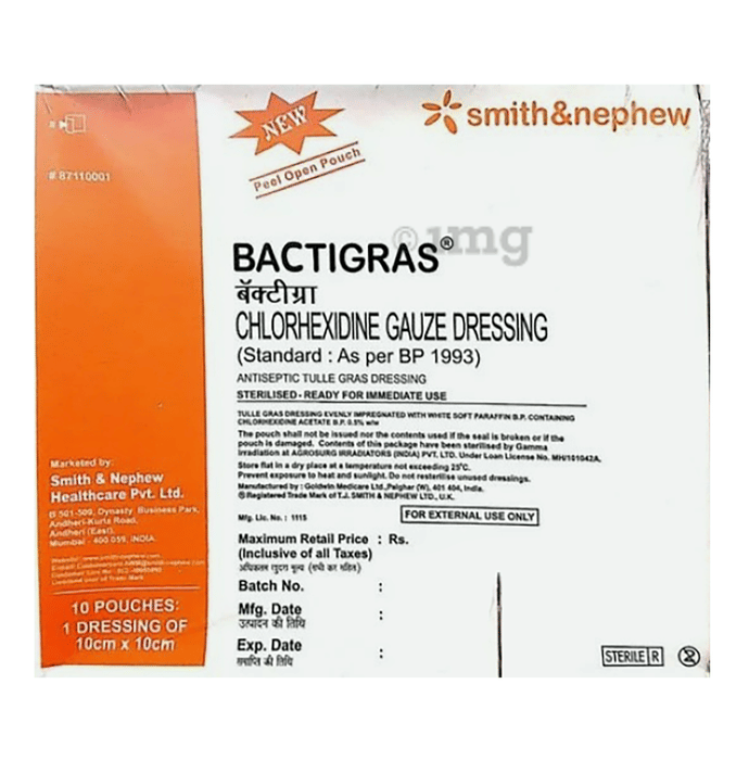 Bactigras Dressing 10cm x 10cm consists of a cotton leno-weave fabric, impregnated with soft paraffin BP, containing 0.5% w/w Chlorhexidine Acetate BP. Chlorhexidine is an antimicrobial agent that is active against a wide range of gram-positive and gram-negative bacteria but inactive against spores, fungi, and viruses. It is more effective against gram-positive than gram-negative organisms, and some species of Pseudomonas and Proteus are of limited sensitivity.