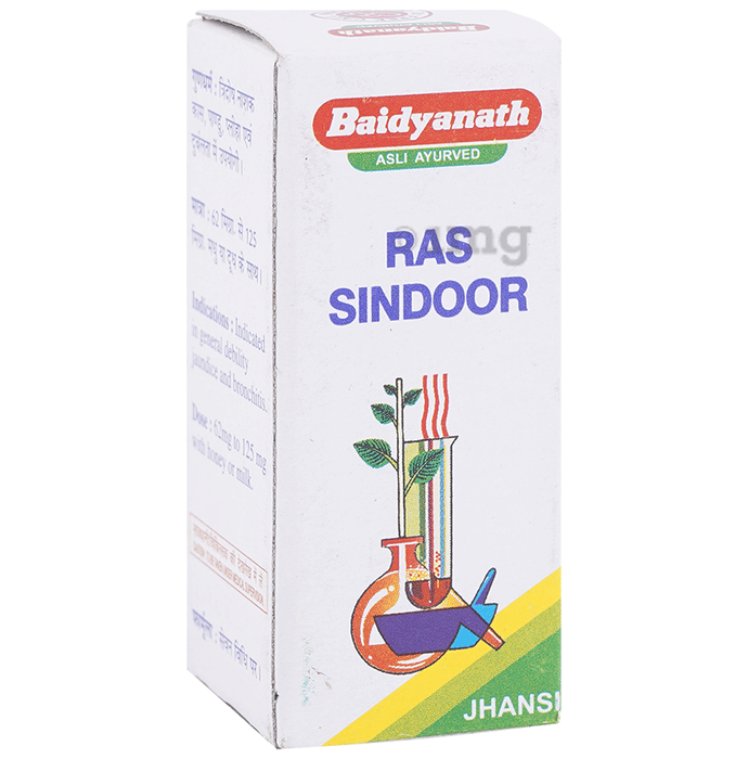 Baidyanath (Jhansi) Ras Sindoor Powder is an ayurvedic medicine made with herbal and mineral ingredients. It may improve immunity and strength and, it can balance vata, pitta and kapha in the body. It is a mercury-based ayurvedic preparation which is useful in reducing inflammation, wounds, urinary disorders and cardiac diseases.