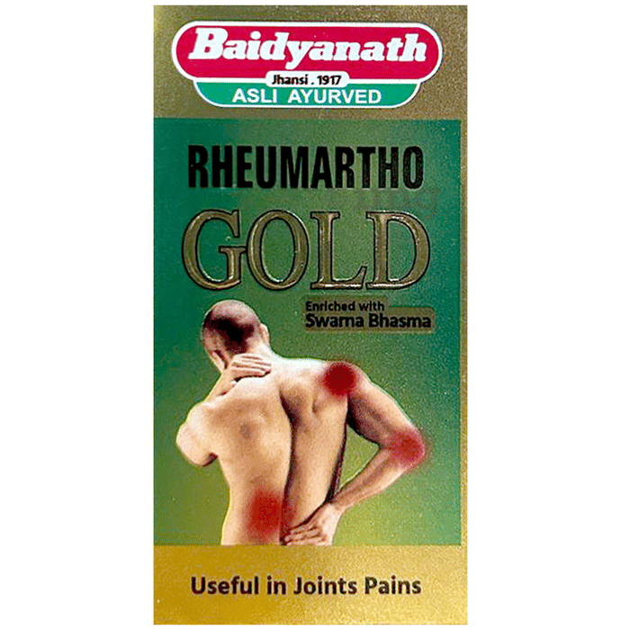 Baidyanath (Jhansi) Rheumartho Gold Pure Gold Capsule is a herbal formulation that can reduce joint pain and inflammation. It is made with natural anti-inflammatory drugs effective in arthritis, rheumatism and osteoarthritis. Gold in the Rheumartho gold capsule can arrest the progression of the disease-involved joints and at least temporarily prevent the involvement of unaffected joints. It can also improve grip strength and decrease the erythrocyte sedimentation rate, abnormal plasma glycoprotein and fibrinogen levels.