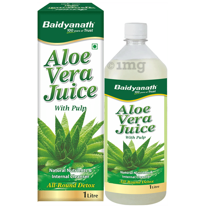 Baidyanath (Noida) Aloe Vera Juice with Pulp is a health supplement that can help the body fight against free radicals and support the immune system. It has antibacterial, antioxidant, and anti-inflammatory properties. Aloe vera is rich in healthy enzymes that facilitate healthy digestion, reduce heartburn, and maintain stomach pH levels. Aloe vera is water-dense and has hydrating properties to help reduce the frequency of acne and pimples and keep the skin nourished and supple.