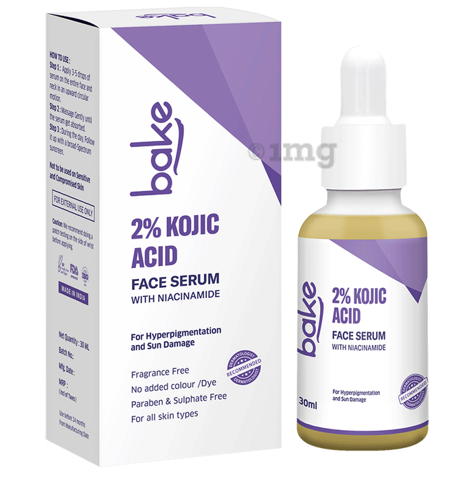 - BAKE 2% Kojic Acid Serum contains a potent combination of Glycolic acid & Niacinamide which work synergistically to exfoliate damaged skin cells, revealing healthier skin underneath, while kojic acid helps inhibit melanin production, reducing the appearance of sun damage such as sun spots and pigmentation