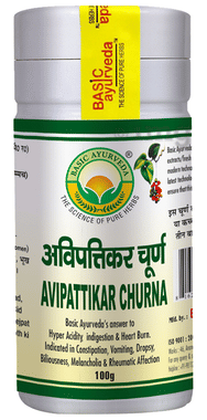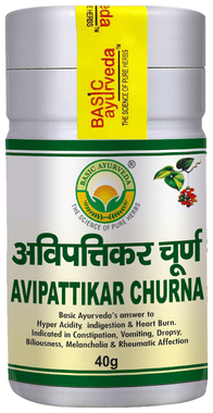 Basic Ayurveda Avipattikar Churna helps to remove excess Pitta (Fire) from the stomach and small intestine. This churna alleviates hyper-acidity, heart burn and indigestion. It contains mild laxative action which makes the stool soft. Moreover, it provides relief in constipation and improves the appetite.