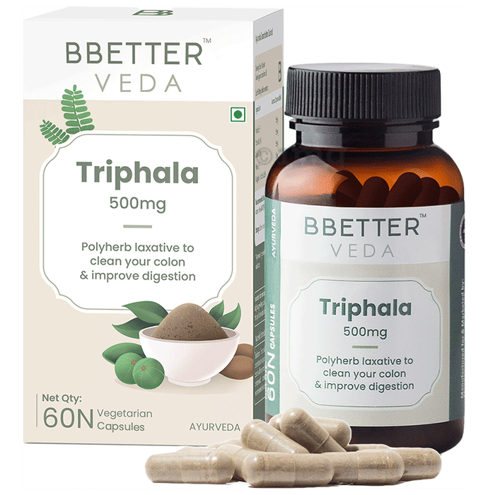 BBetter Veda Triphala 500mg Tablet helps ease bowel movements and keeps your gut happy. Triphala is a helpful supplement to improve your gut health and rid you of digestive issues which can occur very often due to food choices. Triphala is considered to be a natural stomach cleanser and is a great detox supplement. It helps ease many digestive issues like bloating, acidity, constipation, etc. BBetter Triphala helps ease bowel movements.