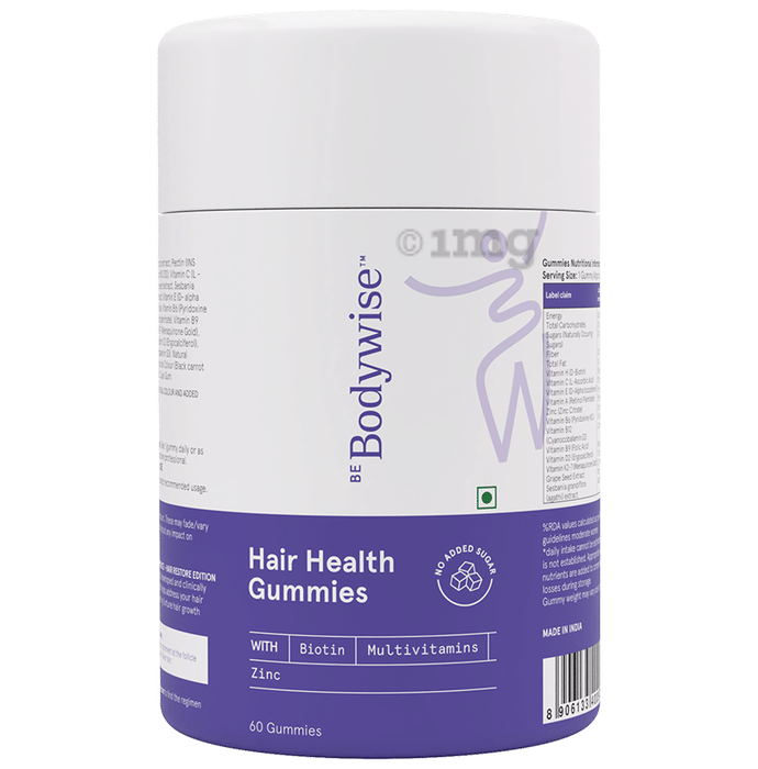 Be Bodywise Hair Healthy gummies No Added Sugar are specially designed gummies formulated with a blend of biotin, zinc, multivitamins, and botanical extracts that can support hair health and overall well-being. Each gummy provides essential nutrients, including vitamins A, C, D2, E, B6, B9, B12, and K2-7, along with grape seed and sesbania extract. This combination may help maintain healthy hair growth, provide nourishment from within, and contribute to overall scalp and hair vitality. With a no-added-sugar formulation, these gummies can be a convenient option for those seeking daily nutritional support for hair care.