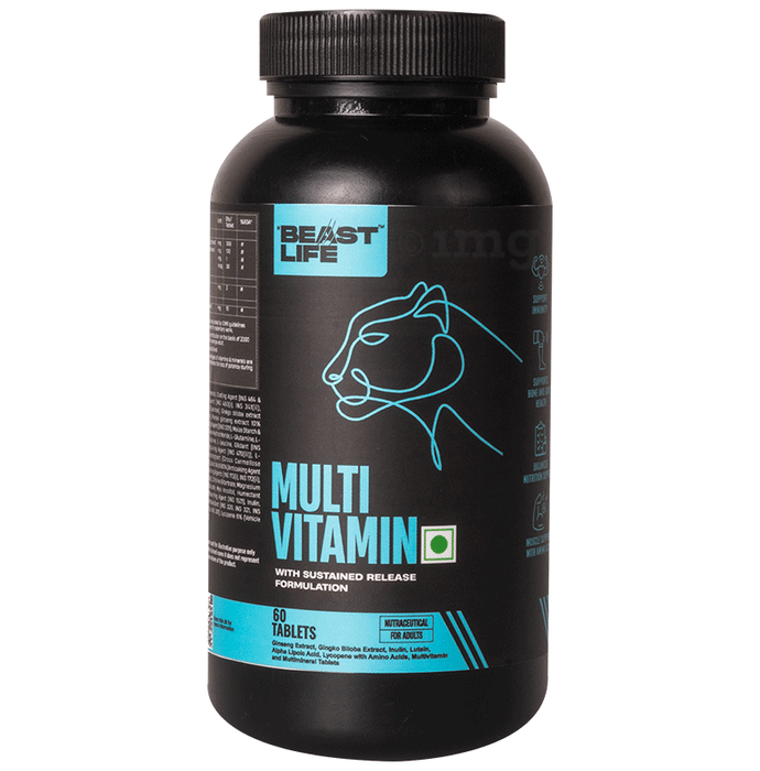 BeastLife Multi Vitamin Tablet SR is a comprehensive blend of essential vitamins, minerals, amino acids, and herbal extracts designed to support overall health and well-being. Formulated for sustained release, this supplement may provide a steady supply of nutrients throughout the day, helping to bridge dietary gaps and maintain optimal physiological function. With key ingredients like Ginkgo biloba, Panax ginseng, amino acids, and antioxidants, it caters to better vitality, immune support, and cognitive function.