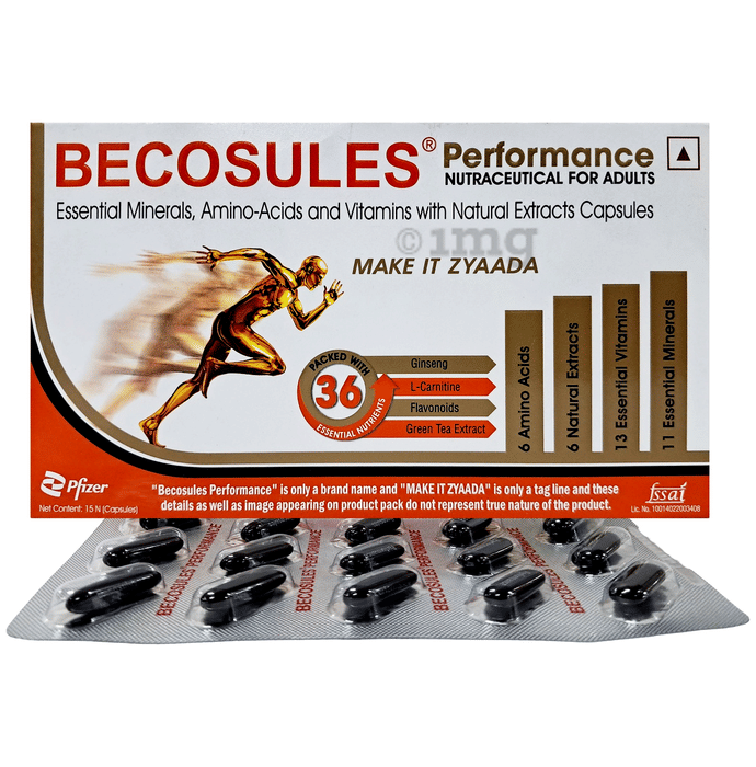 Becosules Performance Capsule is a health supplement containing 41 essential nutrients, including 5 amino acids, 6 natural extracts, 13 essential vitamins, and 13 essential minerals that help increase physical strength and provide energy. The capsule promotes memory, concentration, and coordination.