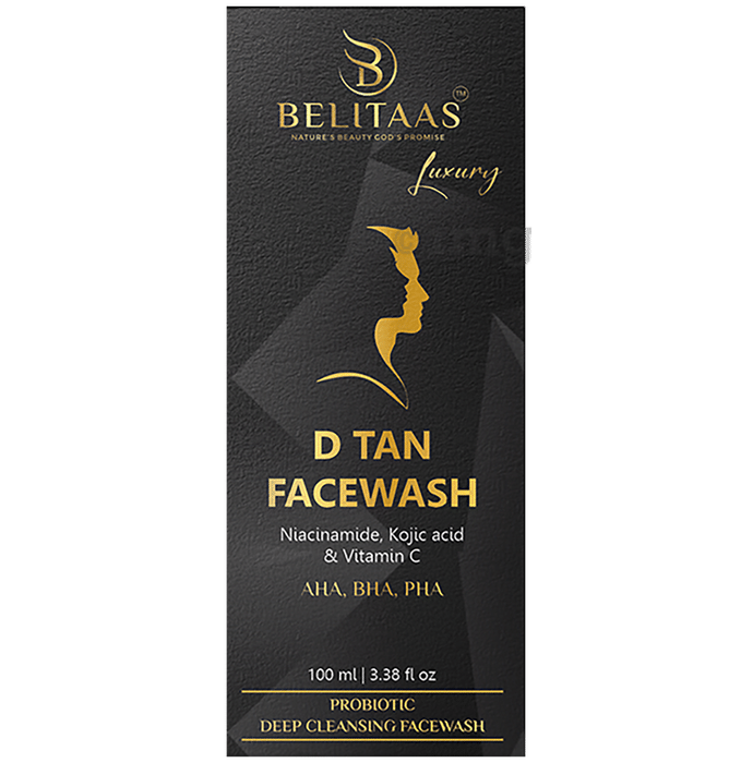 Belitaas Luxury D Tan Face Wash is a probiotic-infused deep-cleansing skincare solution formulated to offer a cleanse while helping the skin appear more radiant and refreshed. Enriched with a potent blend of Kojic Acid, Vitamin C, Niacinamide, AHA, BHA, PHA, and hydrating agents like Aloe Vera and Hyaluronic Acid, this face wash can assist in drawing out impurities, helping your skin feel smooth and balanced. The presence of fruit extracts such as Papaya and Burberry, along with probiotics and Vitamin C, may help contribute to even-toned skin.