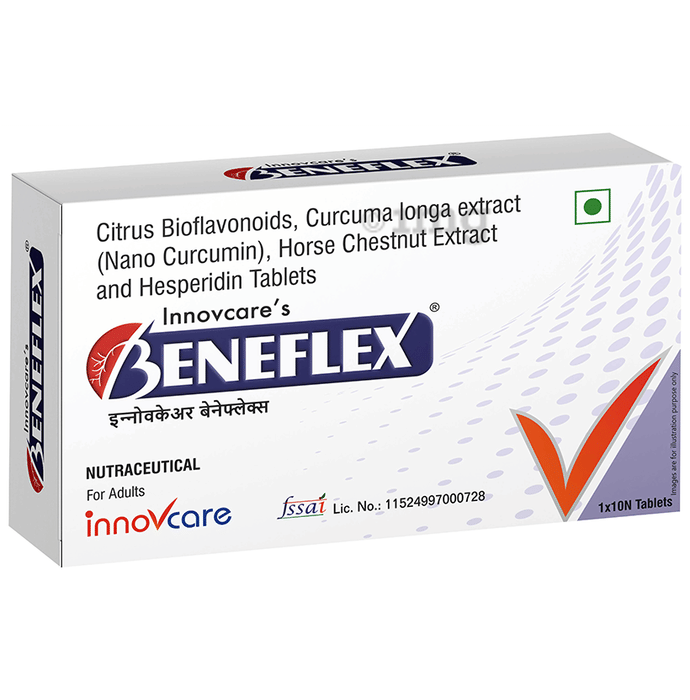 Beneflex Tablet is a dietary supplement crafted to help support vascular health, manage inflammation, and promote overall well-being. Each tablet is enriched with potent ingredients like Diosmin, Curcumin, Horse Chestnut Extract, and Piperine, which may help improve circulation and manage cellular oxidative stress. With natural anti-inflammatory and antioxidant properties, this tablet is formulated to help manage discomfort and maintain overall vascular integrity.