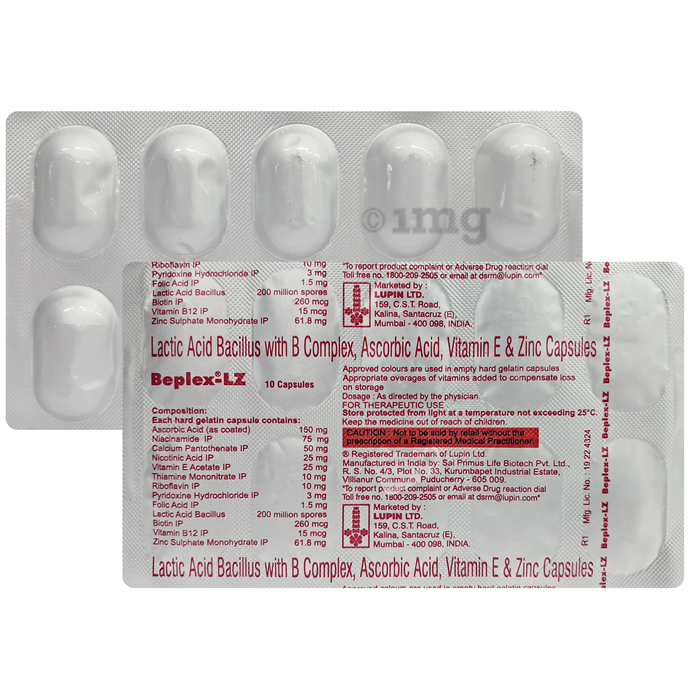 Beplex-LZ Capsule contains lactobacillus sporogenes 200 million spores with a complete therapeutic dose of B-Complex vitamin and various essential vitamins like vitamin C, vitamin E and elemental zinc.
