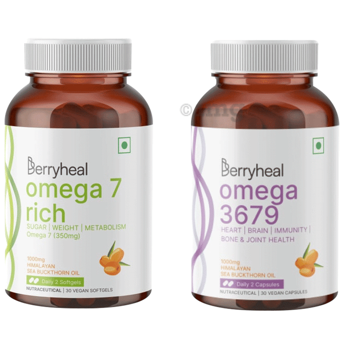 - Complete body wellness: The 4 key omegas along with the nutrient-rich profile of sea buckthorn like flavonoids, rare antioxidants, and minerals offer 360 wellness including support for heart, liver, skin, and joint health. Promotes heart health: Omegas 3,6,9 along with the rare omega 7 offer cardioprotective support by balancing cholesterol and triglyceride levels and reducing arterial inflammation or CRP levels (c-reactive protein) which is a key blood inflammation marker. Essential fatty acids for immune support: Berryheal omega 3679 sea buckthorn capsules contain a balanced blend of omega-3, 6, 7, and 9 fatty acids sourced from pure Himalayan-origin sea buckthorn oil. Abundant in over 190 bioactive nutrients, these capsules help in fortifying your immune systems natural functionality, fostering holistic resilience and well-being. Helps in weight management: Our omega 7-rich capsules act as a weight management supplement by sending signals to the brain to manage excess fat storage thus stopping unwanted body weight. It also helps burn calories more efficiently thus managing excess fat formation. 35% omega 7 concentration: Our concentrated berryheal omega 7 boasts a potent 35% omega-7 content (350mg), providing a powerful dose of this beneficial fatty acid. Created by nature, powered by science: Berry heals organic sea buckthorn oil is harvested from the exclusive Himalayan mountains and contains omegas 3,6,9 and the rare omega 7 from a single plant source. Our products are vegan and gluten-free: We extract our oils using a supercritical CO2 method that preserves the rich nutrient profile of sea buckthorn without any risk of oxidation, resulting in a high-quality whole omega capsule that impacts your body health. Medical research confirms that 220mg of omega-7 consumed over 4-6 weeks can contribute to maintaining normal metabolism. For optimal results, our recommendation is to consume 2 x 500mg capsules per day over a 2-3 month period.