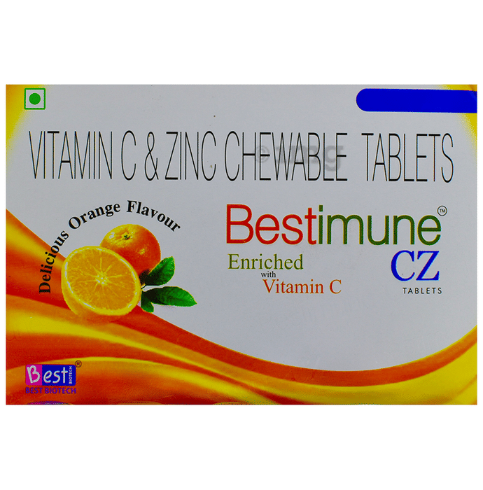 Bestimune CZ Chewable Tablet is a supplement for people in need of vitamin C. It helps in boosting immunity and metabolism in the body. It contains vitamin C, which aids in the body's growth and development, cartilage maintenance and tissue healing. It contains zinc, which boosts the body's immunological response, improves wound healing and reduces inflammation. It also aids in the reduction of oxidative stress.