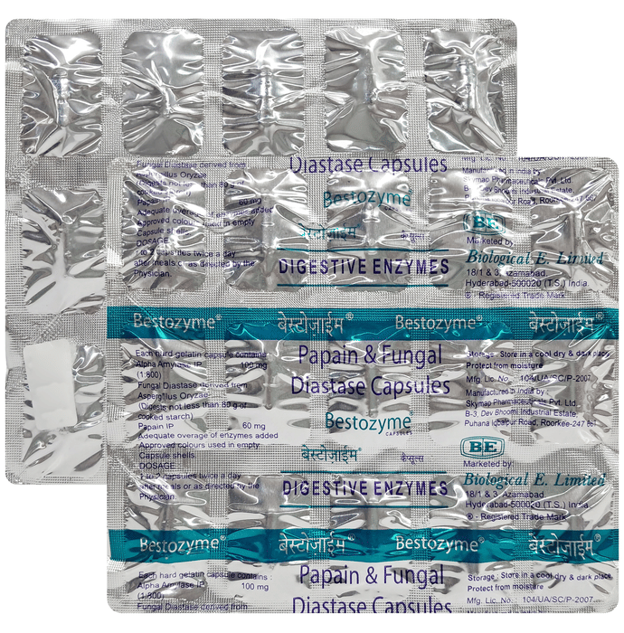 Bestozyme Capsule is a dietary supplement with digestive enzymes that can help with digestion and stomach problems. It contains amylase and papain that can help with indigestion, bloating, gas, and loss of appetite due to chronic illness. Papain, extracted from papaya, is an enzyme that breaks down proteins in the stomach and helps with digestion.