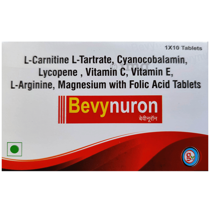 Bevynuron Tablet is a comprehensive nutritional supplement designed to help support red blood cell formation, antioxidant protection, cardiovascular function, and overall metabolic health. It contains a synergistic blend of L-Carnitine L-Tartrate, Cyanocobalamin (Vitamin B12), Lycopene, Vitamin C, Vitamin E, Folic Acid, Magnesium, and L-Arginine. These ingredients may work together to help aid against oxidative stress, support energy production, and maintain nerve and cardiovascular function. This supplement can be beneficial for individuals with increased nutritional needs.